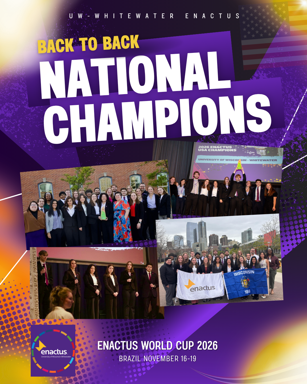 The University of Wisconsin - Whitewater Enactus Team is one of over 1,700 teams in thirty-six countries using the positive power of business to improve the quality of life and standard of living for people in need. Our team believes in Leadership and Innovation that acts as a catalyst for building sustainable business solutions to critical problems facing our communities and the planet.